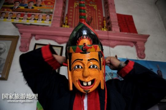 國家旅游地理 廣西河池8月19日訊 8月18日,譚圣慈老人(左一)帶著前來學(xué)習(xí)的兩名男孩跳儺面舞。在廣西北部與貴州交界一帶的我國唯一的毛南族自治縣——環(huán)江毛南族自治縣,神秘的儺戲被譽為毛南族的“族寶”。原始古樸、風(fēng)格獨特的儺戲是毛南族的民間傳統(tǒng)舞蹈,藝人在表演過程中經(jīng)常戴著被稱為儺面的木制面具。儺面一般高30厘米、寬20厘米,由毛南族藝人在民族口頭文學(xué)的基礎(chǔ)上依據(jù)個人想象創(chuàng)作,用優(yōu)質(zhì)木塊雕琢而成,共有文、武、善、兇四大類72種面相。