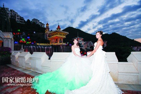 乘著電瓶車,從客天下廣場穿過雅致的圣山湖住宅區(qū),赫然出現(xiàn)在眼前的卻是大型婚禮殿堂,純歐式的建筑群隱匿在青山綠水中:乳白色的圓形屋頂、七彩斑斕的玻璃窗、富麗堂皇的大吊燈,見證了一對又一對新人走進幸福的殿堂。在充滿異域風(fēng)情的幸福里大街,蘇格蘭風(fēng)笛表演、皇家馬車、中世紀格調(diào)的咖啡館,一幕又一幕,讓人恍若時空交錯。