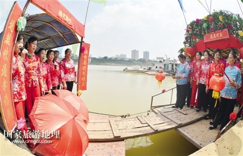 國家旅游地理 廣西南寧10月3日訊(記者 龍博 實(shí)習(xí)生 雷麗軍/文 記者 段柳健/圖) 金秋十月的邕江河畔,秋高氣爽,碧水粼粼。昨日,從南寧港的江邊傳來陣陣漁歌與歡喜的嗩吶聲,原來,水上人家周木蘭家在這一天嫁女,一場古樸而傳統(tǒng)的水上婚禮儀式正在邕江岸邊拉開序幕。隨著水上人家的上岸,這樣的傳統(tǒng)婚俗儀式越來越少見,而獨(dú)特且略顯神秘的婚俗也吸引了四面八方過來湊熱鬧的人們。