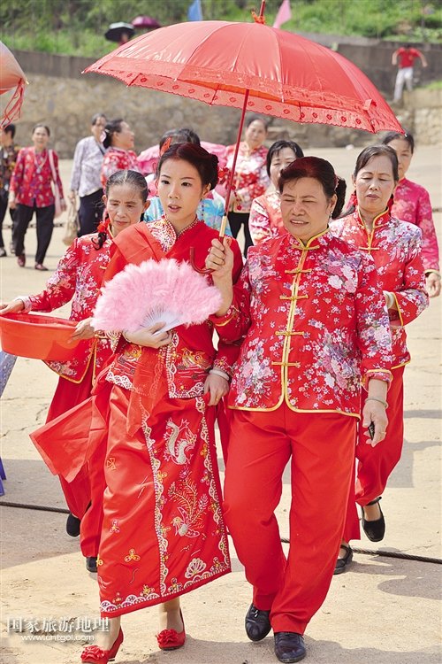 “五世其昌”的祝福對聯(lián),大紅的喜慶燈籠,插滿青草與鮮花的漁船顯得古樸而富有情調(diào)。而岸上的儀式也頗有講究:一張精心準(zhǔn)備的圓桌,擺著一盆四季橘,一只展翅欲飛、口銜“金幣”的“鳳凰雞”,寓意飛黃騰達(dá)。一對紅燭、算盤、鏡子、糯米飯等物品,均取吉祥如意之意。迎娶新娘的時辰未到,新娘的兩位兄嫂幫她梳妝打扮,描眉盤發(fā),給發(fā)髻插上珠玉釵,換上喜氣的紅綢裙,一番梳妝打扮之后,新娘變得美艷動人。裝扮完畢,新娘邀請自家姐妹及親戚“擺歌堂”,感激父母養(yǎng)育之恩,傾訴依依惜別之情。