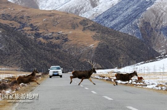 國家旅游地理 西藏拉薩11月3日訊 11月2日,在西藏工布江達(dá)縣境內(nèi),一群白唇鹿在通過公路。白唇鹿是我國特有的珍稀物種,為國家一級重點(diǎn)保護(hù)動物,分布在青海、甘肅及四川西部、西藏東部。 /新華社記者文濤攝