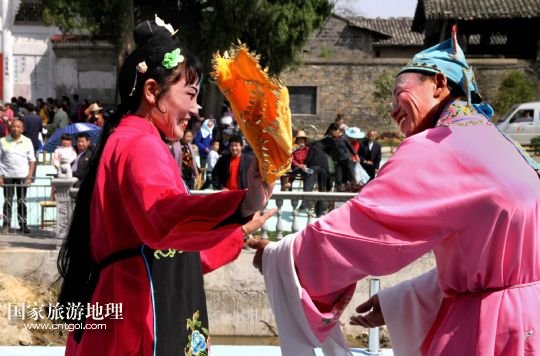 4月28日,江西省靖安縣中源鄉(xiāng)農(nóng)民劇團的農(nóng)民為游客表演地方戲。