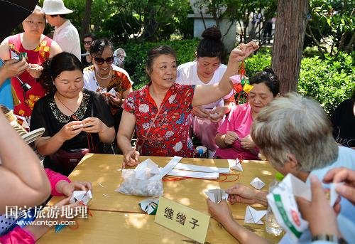 5月28日,手工老師顧小玲(中)在后海小廣場向學習者展示她纏的繒子。