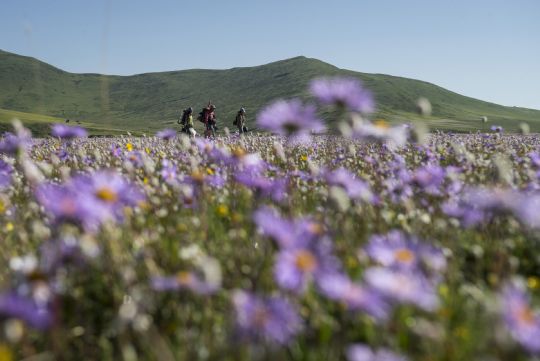 6月19日,幾位游客走進(jìn)俄木塘草原花海。