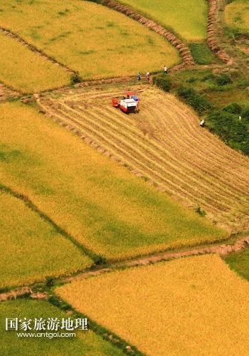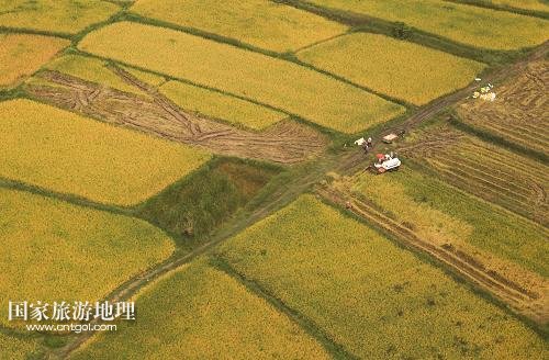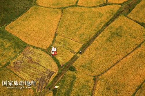 國(guó)家旅游地理 江蘇淮安9月27日訊 這是9月26日航拍的江蘇省淮安市盱眙縣鮑集鎮(zhèn)稻田收獲圖景。近期,江蘇省各地的水稻產(chǎn)區(qū)陸續(xù)開(kāi)鐮收割。收割機(jī)踏著大地的指紋收獲金黃的稻谷,繪就一幅幅美麗的豐收?qǐng)D畫(huà)。新華社發(fā)(周海軍 攝)