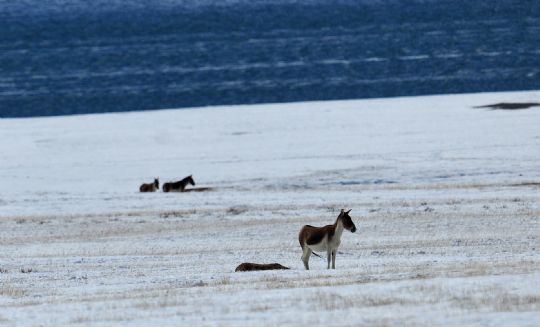 在西藏阿里地區(qū)普蘭縣境內,幾只藏野驢在雪地里覓食(10月19日攝)。