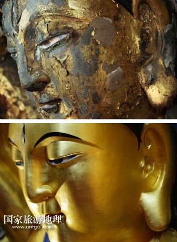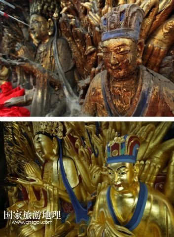 國家旅游地理 重慶6月13日訊 修復(fù)前后的重慶大足千手觀音造像局部(拼版照片,上圖上:2011年2月24日攝,上圖下:2015年3月31日攝)。