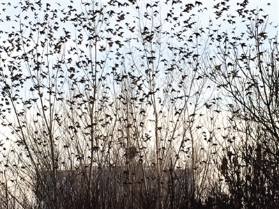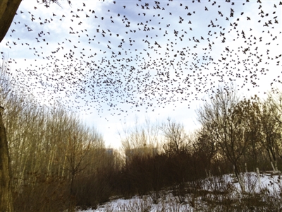 2015年12月30日下午,我在銀川市興慶區(qū)北塔公園游覽。走到北塔東北的樹(shù)林邊,突然看見(jiàn)一棵有些怪異的樹(shù)——數(shù)九寒冬,為何還有這么多樹(shù)葉?仔細(xì)一瞧,哪是什么樹(shù)葉,是數(shù)千只麻雀在樹(shù)上“開(kāi)會(huì)”。密密麻麻,嘰嘰喳喳,無(wú)拘無(wú)束。我拿出手機(jī),剛拍了幾張,不知是聽(tīng)了什么號(hào)令,麻雀?jìng)?ldquo;散會(huì)”了,瞬間全部飛向藍(lán)天,一個(gè)個(gè)狀如小飛機(jī)??吹贸?,麻雀?jìng)兺ο矚g銀川,活得挺自在。(通訊員 蓮子)