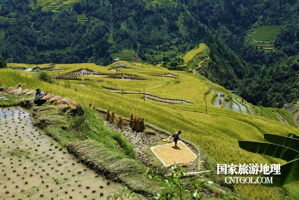 在陽光照耀下,層層疊疊的梯田從山腳盤繞到山腰,放眼望去,金燦燦的梯田布滿山間,層層梯田,連綿起伏,拾級(jí)而上,金黃燦爛,小山如螺,大山似塔,高低錯(cuò)落。蜿蜒如春螺、披嵐似云塔,秀美如畫。
