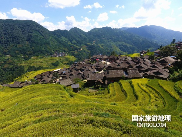 9月5日,貴州省黔東南苗族侗族自治州從江縣加榜鄉(xiāng)黨扭村和加車村近萬畝水稻開鐮收割。圖為:鑲嵌在田園中的苗家吊腳樓。