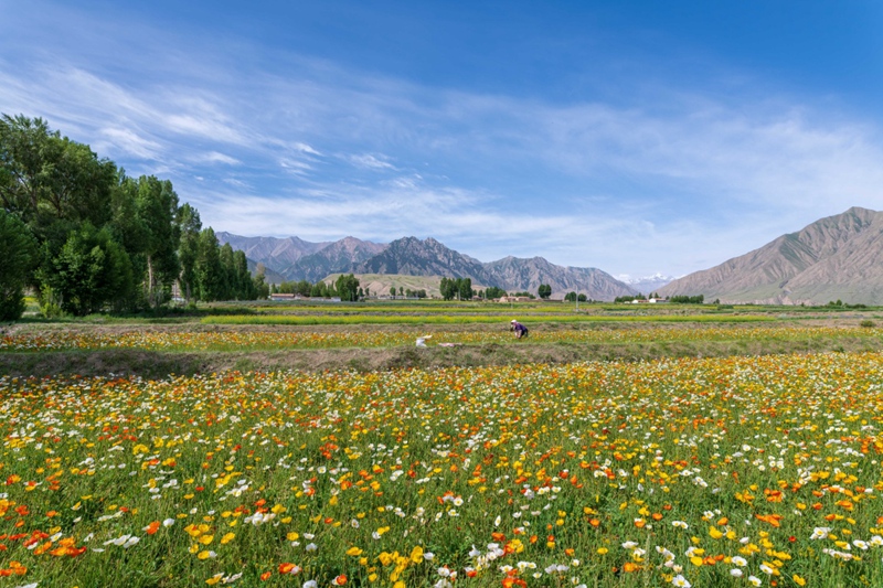 地處祁連山北麓高海拔山區(qū)的甘肅省高臺縣新壩鎮(zhèn)紅沙河村種植的虞美人繽紛綻放